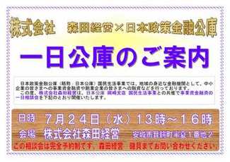 ※「一日公庫」とは ……… 一日公庫とは、森田経営の事務所で行う日本政策金融公庫の借入相談会の事を言います。